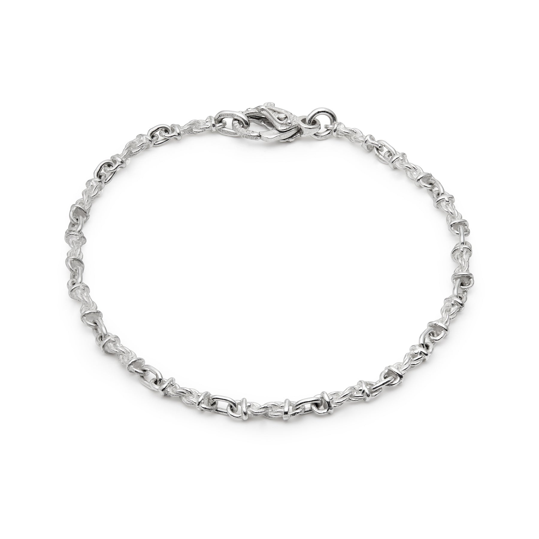 Le sottili ed eleganti maglie di questo bracciale sono allegoria del rapporto tra tutte le cose ed espressione della legge più intima che governa le relazioni universali. Ogni maglia, rigorosamente realizzata e rifinita a mano, è ritorta su se stessa per tre volte e ulteriormente intrecciata con la maglia adiacente. Esse creano così un piccolo spazio vuoto, ma non assente: egli dà forma, peso e volume al bracciale stesso.