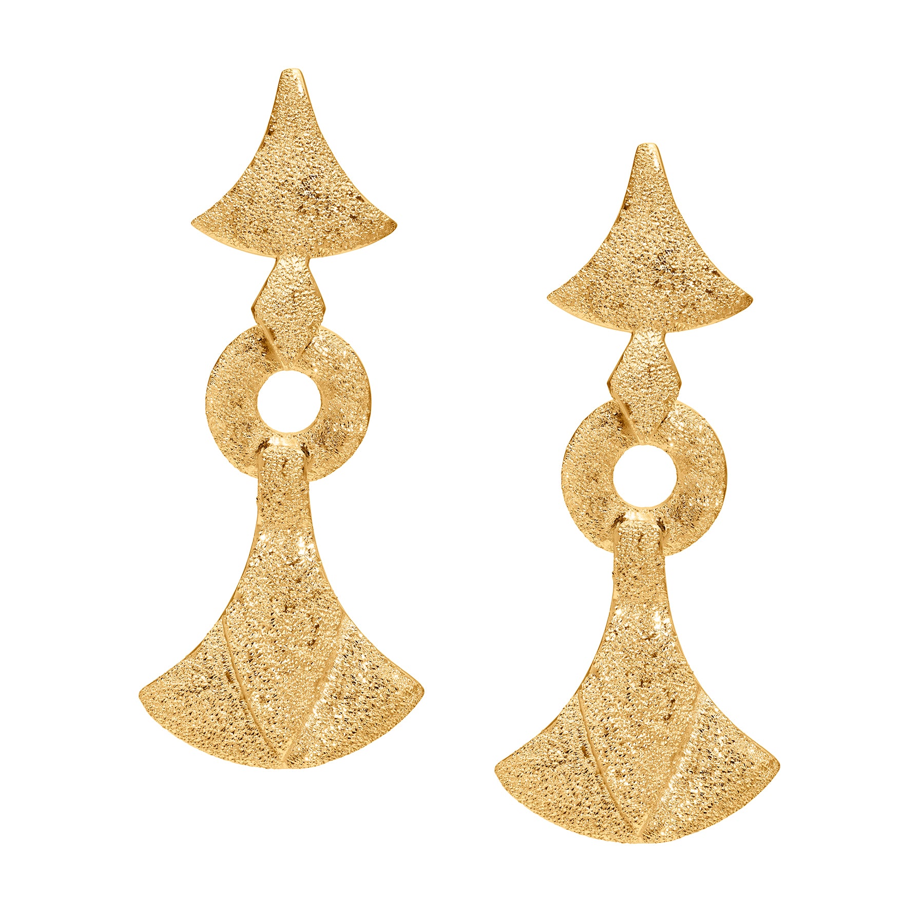 I tre moduli che compongono gli Orecchini Papiro sono uniti l'un l'altro da un perno che permette un delicato e leggero movimento che ricorda il tintinnio dei gioielli indossati nell'Antico Egitto: due forme di papiro stilizzato unite da un cerchio leggermente bombato.
