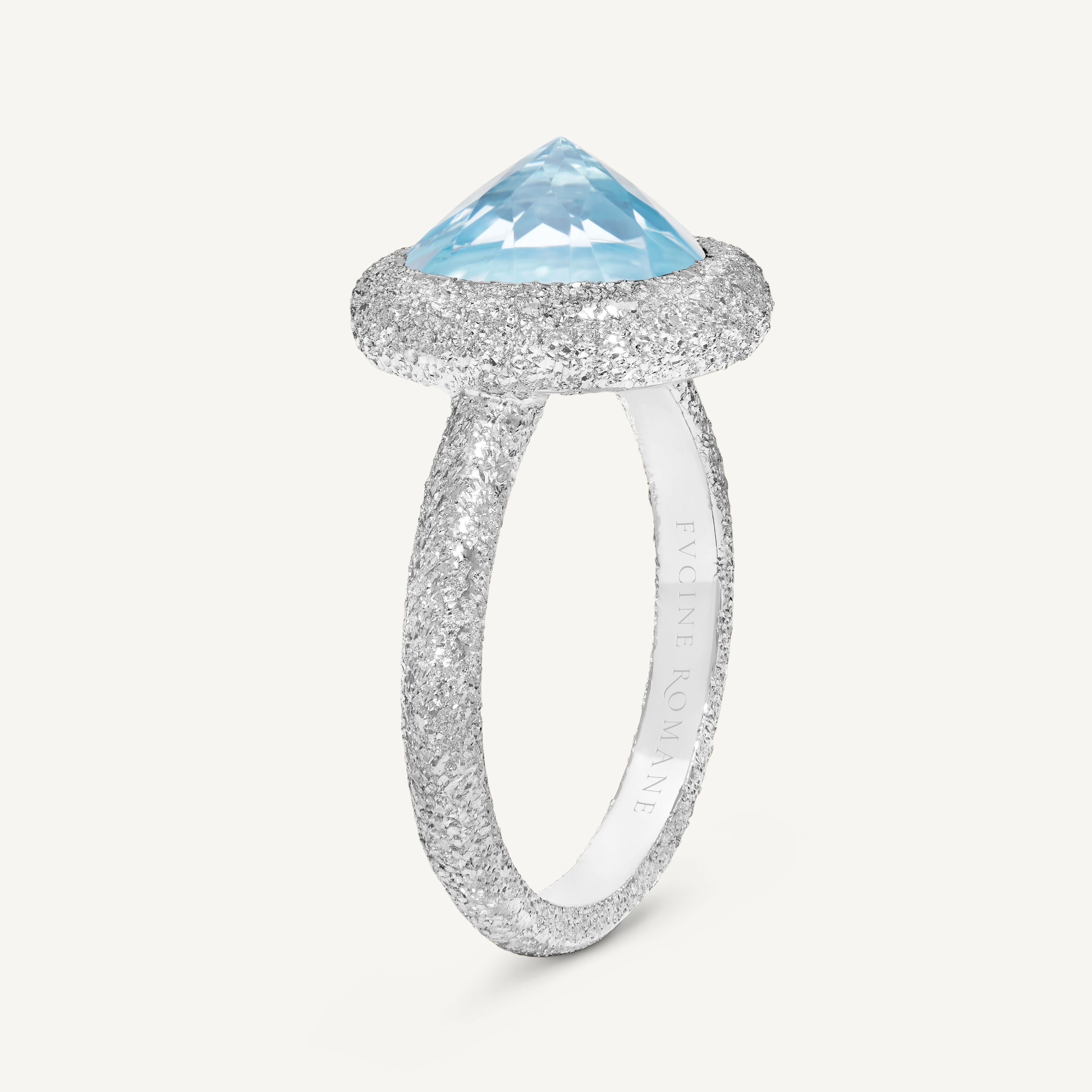 Un pregiato Topazio azzurro dalle opulente dimensioni è l'indiscusso protagonista di questo iconico anello.