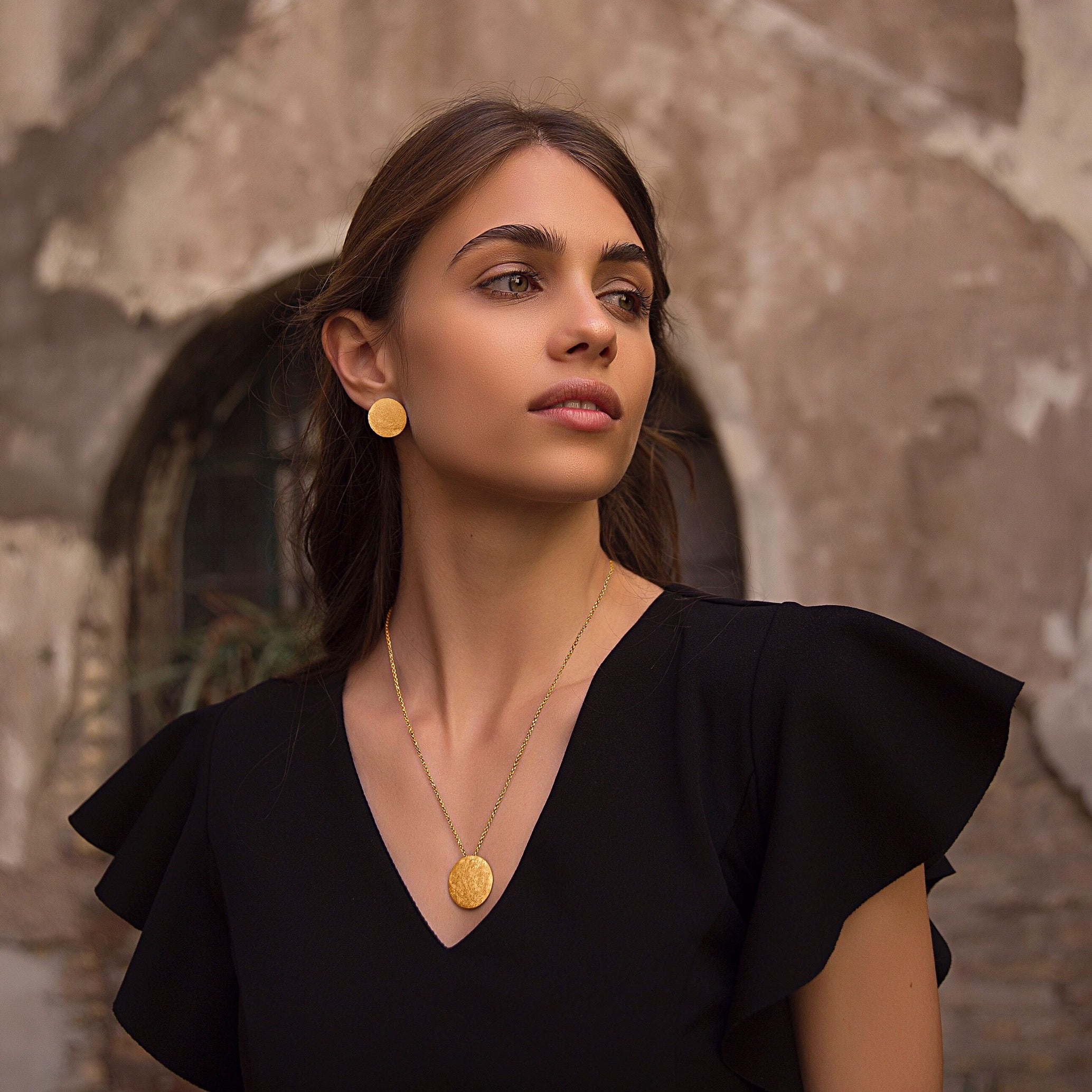 Mitologia e storia si intrecciano in questo elegante gioiello le cui radici affondano nel mito del Dio del Sole Helios, sacro ai Greci e in quello del Dio egizio Ra, figlio del Sole e Sole egli stesso. A Roma si celebrava il "dies natalis Solis Invictis", il Natale del Sole Invitto, ovvero la rinascita sull'orizzonte del nuovo Sole, che era simbolicamente morto al solstizio d'Inverno, e ne celebrava la vittoria sulla tenebre. Adornare il Corpo e Abbellire l'Anima con questi orecchini significa dunque volgere lo sguardo nell'anima dei nostri antenati.